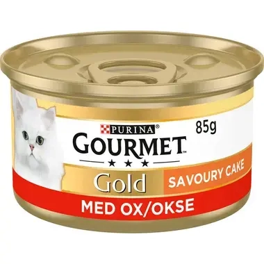 GOURMET™ Gold Savoury Cake innehåller fint skurna bitar av ox, varsamt kryddade med en gnutta sås. De förenas i en läcker måltid som din katt njuter av i varje tugga.