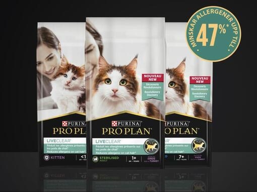 Pro Plan® LiveClear® ersätter inte andra strategier för personer som är känsliga mot kattens allergener, utan är en kompletterande metod som hjälper till att reducera allergener i hem med katter.